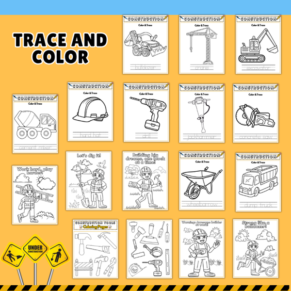 Color & Trace Pages Ten worksheets featuring tools, signs, and vehicles for tracing shapes, letters, and numbers.